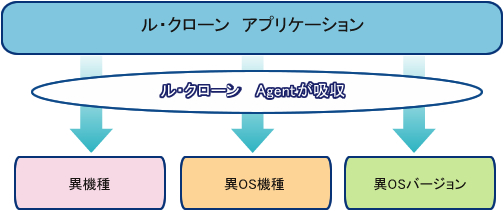 作成したアプリケーションは、異機種/異OS間での互換性があります。 また、OSのバージョンアップもル・クローンが吸収し、完全上位互換を実現しているため、 1度完成したシステムをOSの進化を取り入れつつさらにエンハンスしていくことが可能です。